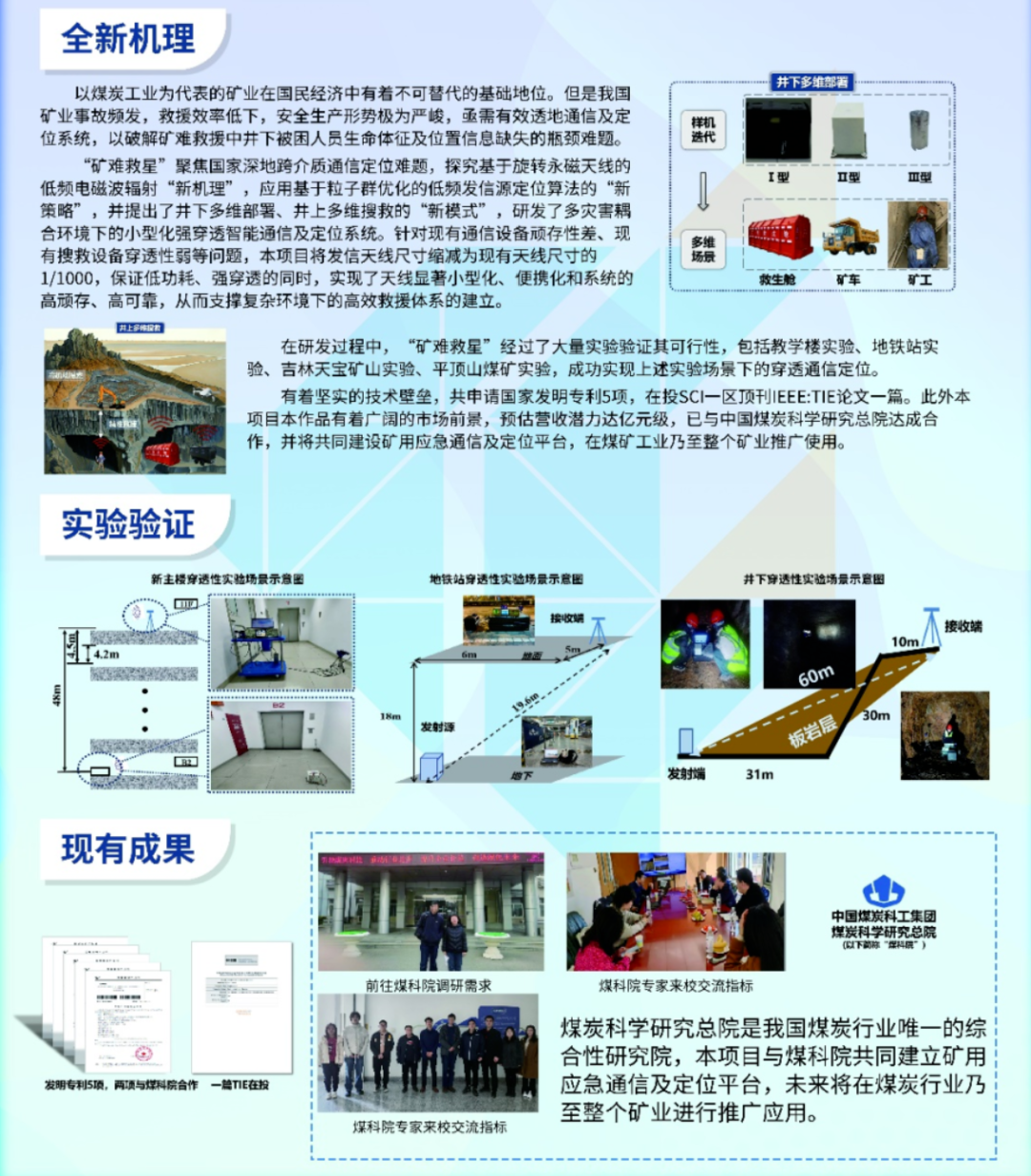 项目简介:以煤炭工业为代表的矿业是国民经济的支柱产业,但我国矿业事故频发,救援效率低下,亟需有效透地通信及定位手段,以破解井下被困人员生命体征及位置信息缺失的瓶颈难题。"矿难救星"探究旋转磁波天线的"新机理",提出PS0优化定位的"新算法",构建井下井下多维部署的“新模式”实现了小型化、强穿透、高可靠。“矿难救星”共申请发明专利3项,获33届冯如杯主赛道制作组一等奖,与煤炭科学研究总院达成合作意向。