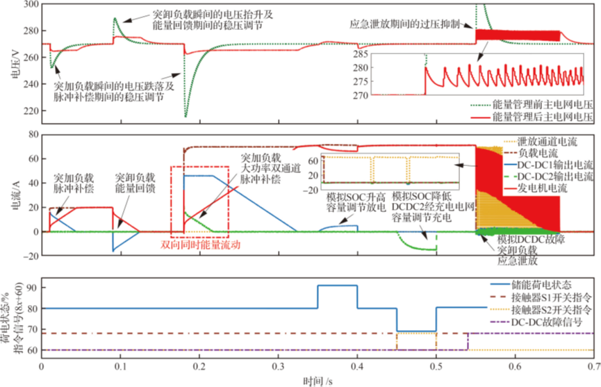 本文提出了一种基于电网电压-负载电流和蓄电池荷电状态的综合能量管理策略,采用基于微分跟踪方法的多模式状态机实现系统负载扰动的快速检测和供电模式的快速配置。通过仿真验证了状态转移逻辑的准确性,以及所提出脉冲补偿、能量回馈吸收、储能容量调节和应急泄放功能的有效性。本文还引入了微分跟踪器与负载电流前馈相结合的稳压控制算法,显著提高了系统在全负载范围内的动态响应速度和稳压精度。