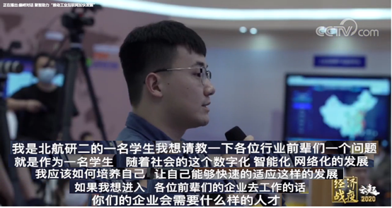 2020年5月28日,由央视网和中国信息通信研究院、工业互联网产业联盟等共同策划推出全国两会“《经济战疫-云起》——推动工业互联网加快发展”特别节目。我校威廉希尔williamhill官网系统仿真与智慧制造系2019级研究生孔宇升作为部属院校青年学生代表受邀参加。