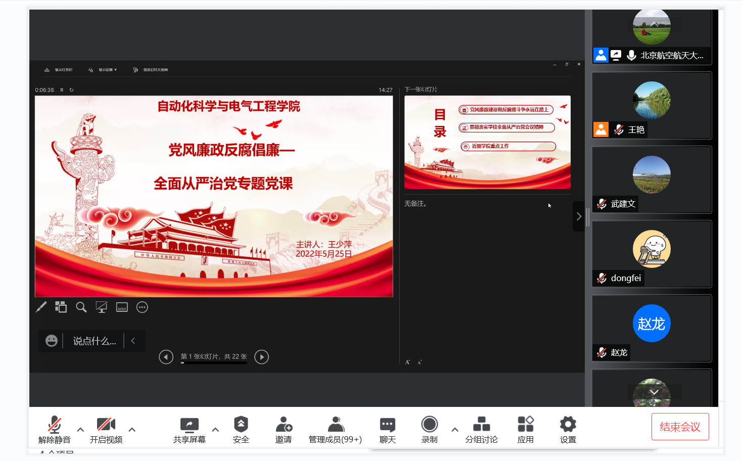 2022年5月25日威廉希尔williamhill官网党委书记王少萍做了“从严治党暨党风廉政建设”专题党课。会议以线上腾讯视频会议方式进行,学院全体教职工参加了本次集体学习活动。