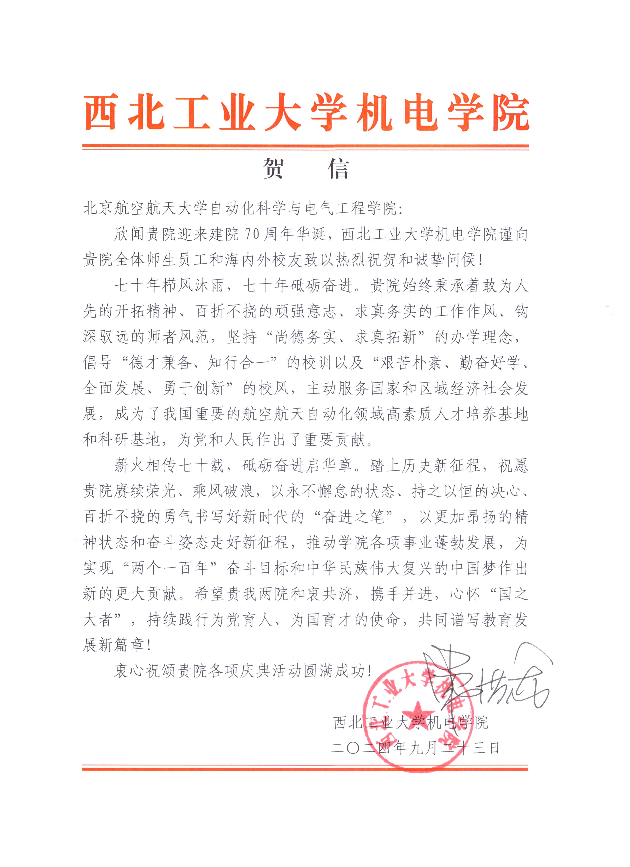 西北工业大学机电学院贺信